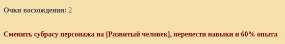 Несколько дней назад мы включили возможность выбирать между вторым персонажем и улучшением персонажа до новой субрасы сохраняя 60% опыта.